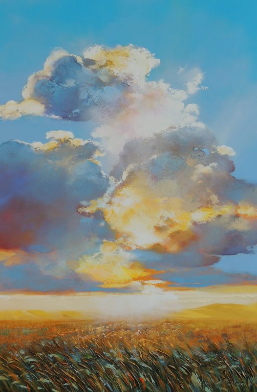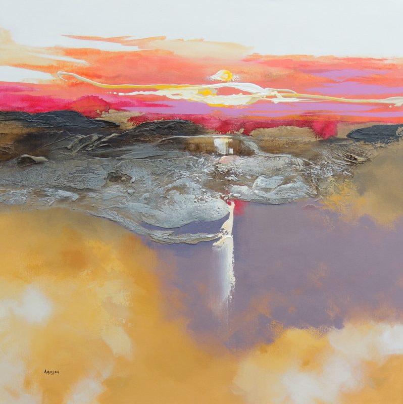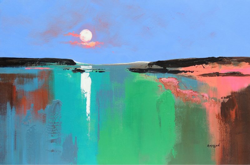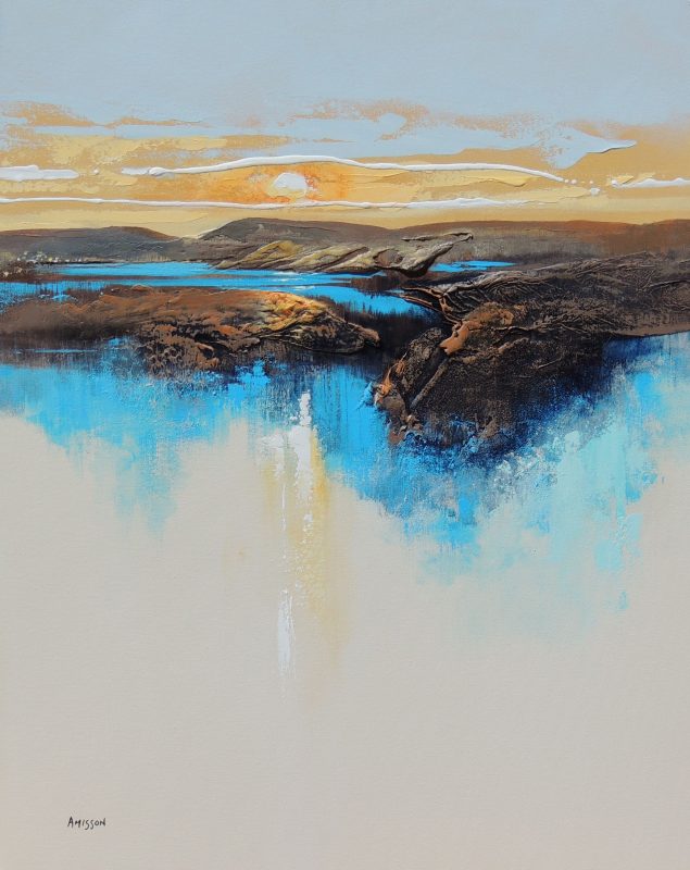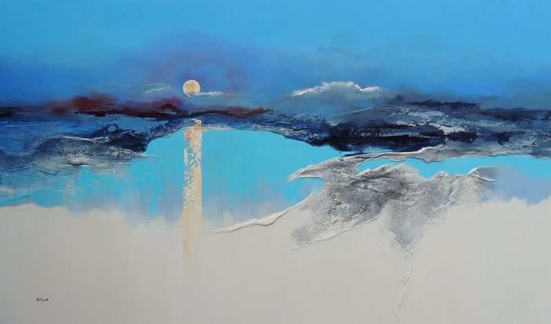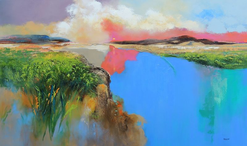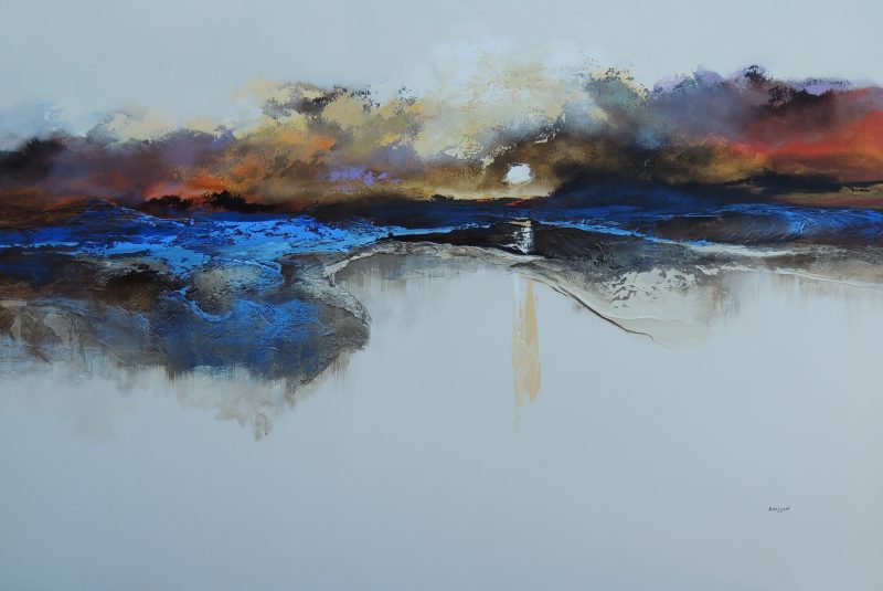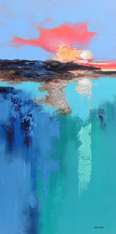 Her more recent work in acrylics has opened up a novel and challenging approach to her interpretation of familiar settings. Kathryn’s joy of the calm and the fury of our ocean is characteristically echoed in this scintillatingly new artistic direction.