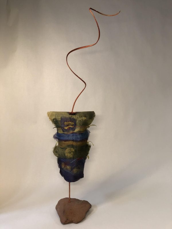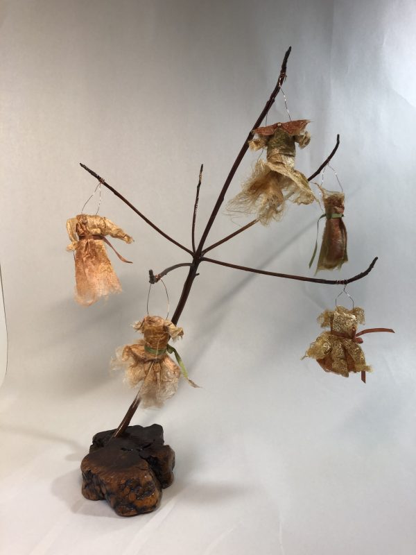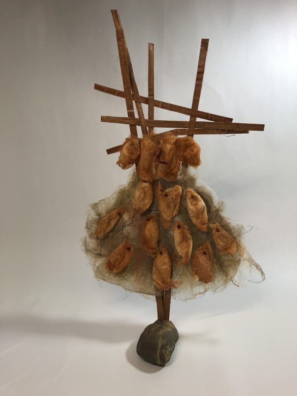 For silk fusion I lay out dyed silk fibres and fuse them together with a textile medium to make sheets which I then dampen and mold into shapes. Recently, I have discovered how versatile gut is, even though it handles like wet plastic wrap. My husband and many other people help me in ‘shopping’ for natural materials from farms, beaches and the woods but the ‘fibre’ is where I begin.”