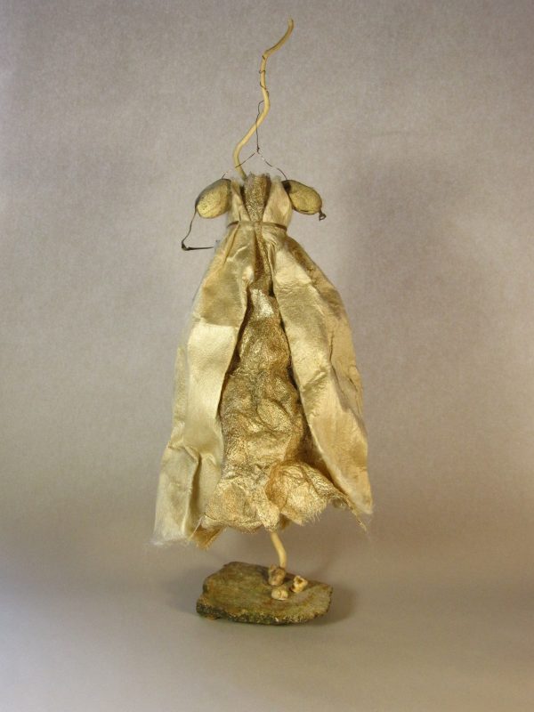 “In my past life I played the harp and worked in fashion retailing so being surrounded by beautiful city clothes was my artistic starting point. But here on Salt Spring I am surrounded by the beauty of nature so I work to juxtapose the two, preferably on a very small scale. It is a way of connecting the past with the present and wondering how it will all turn out.