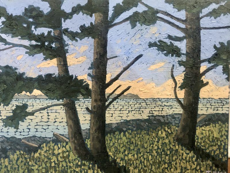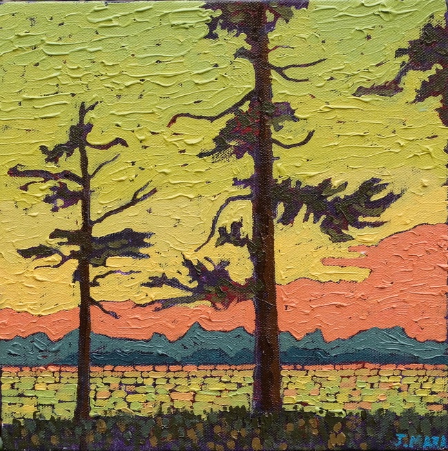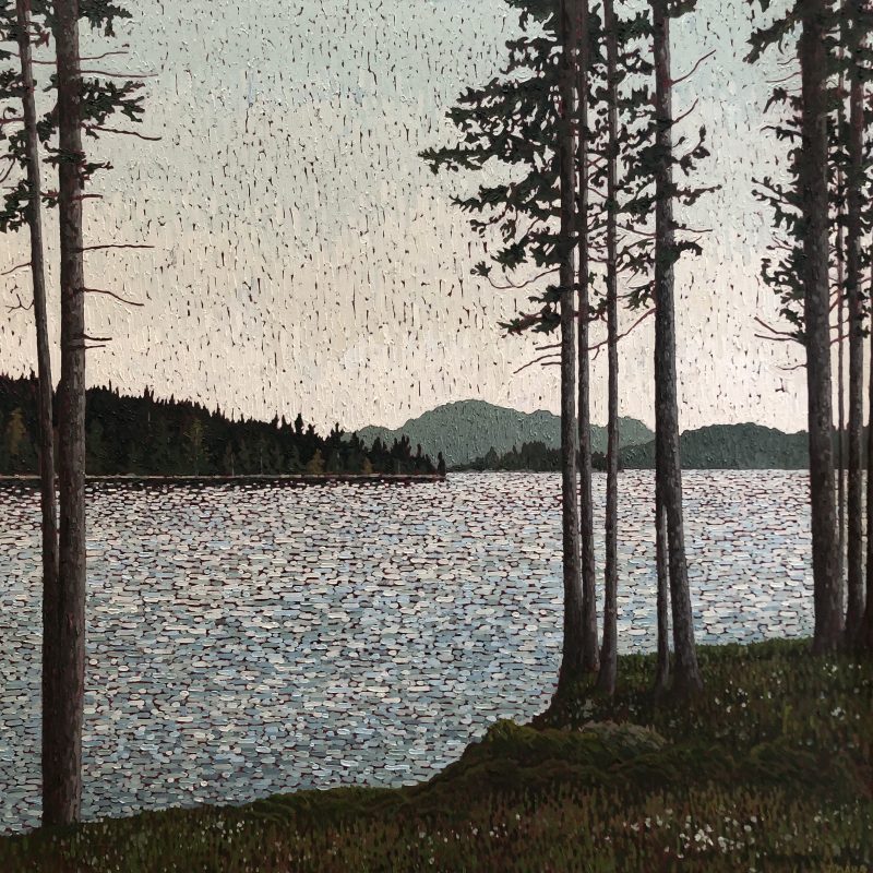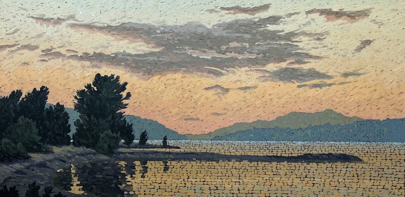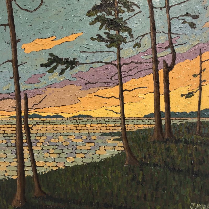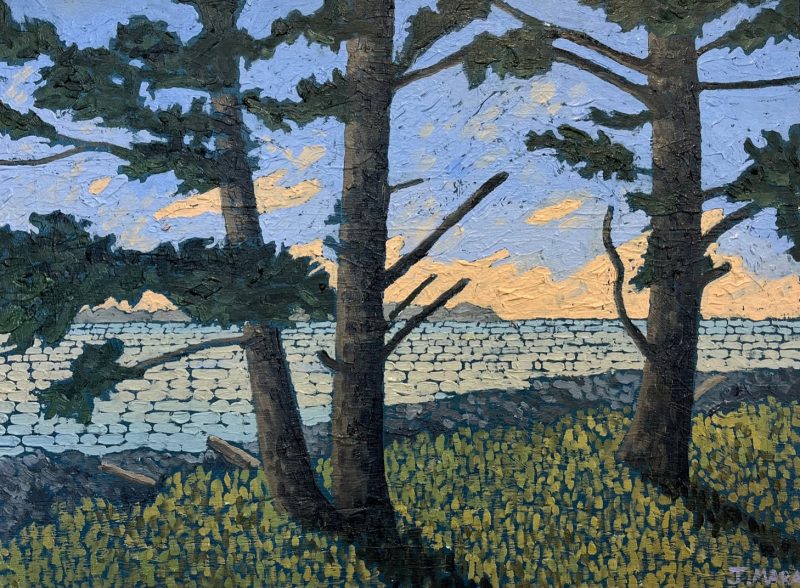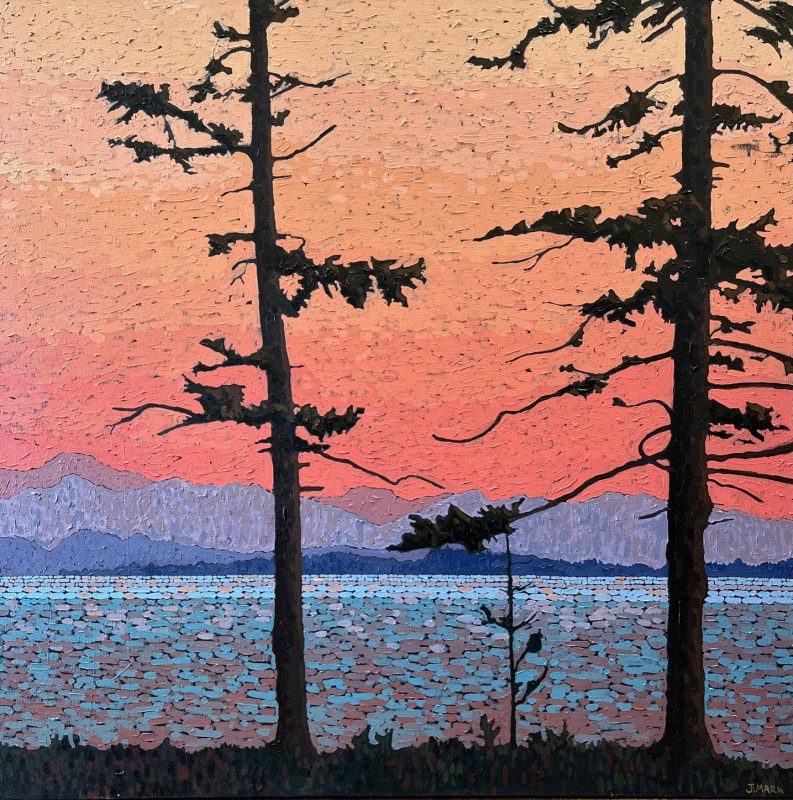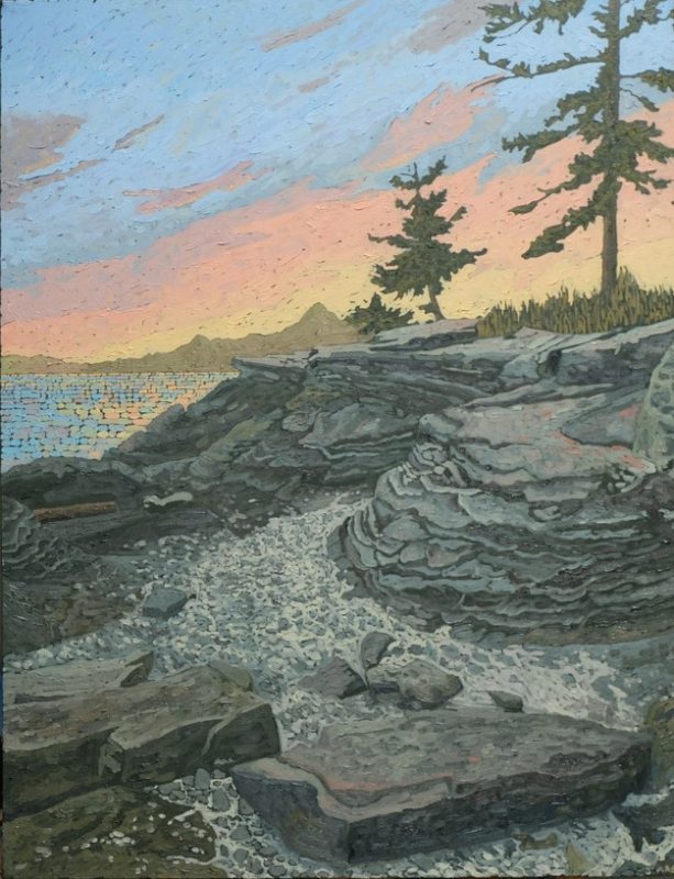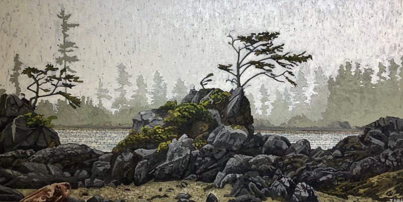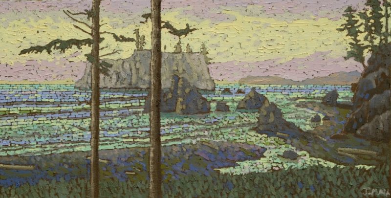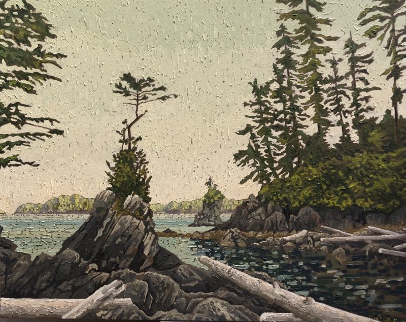 In 2003 he became interested in the landscapes of the West Coast. They appealed to his sense of design. The flat horizon, the calm field of the sea, the chaotic shapes of weathered rock, ancient moss covering a tree or a rugged coast thickly covered in pines. He decided to make these his main theme for painting. Some of the first places he chose for painting were Broken Island Group and Whitecliff Park. Joel looks for natural scenes of moving beauty, striving to capture this feeling on the canvas itself.