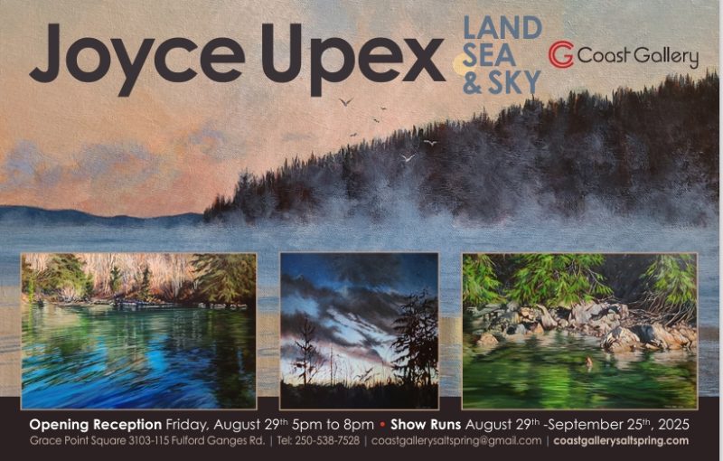 TweetPinShare0 SharesPlease join us for our Opening Reception of Land, Sea & Sky Exhibition featuring Paintings by Joyce Upex opens Friday August 29th, 2025. Opening Reception – Friday August 29th from 5pm to 8pm. The Exhibition runs from August 29th to September 25th TweetPinShare0 Shares